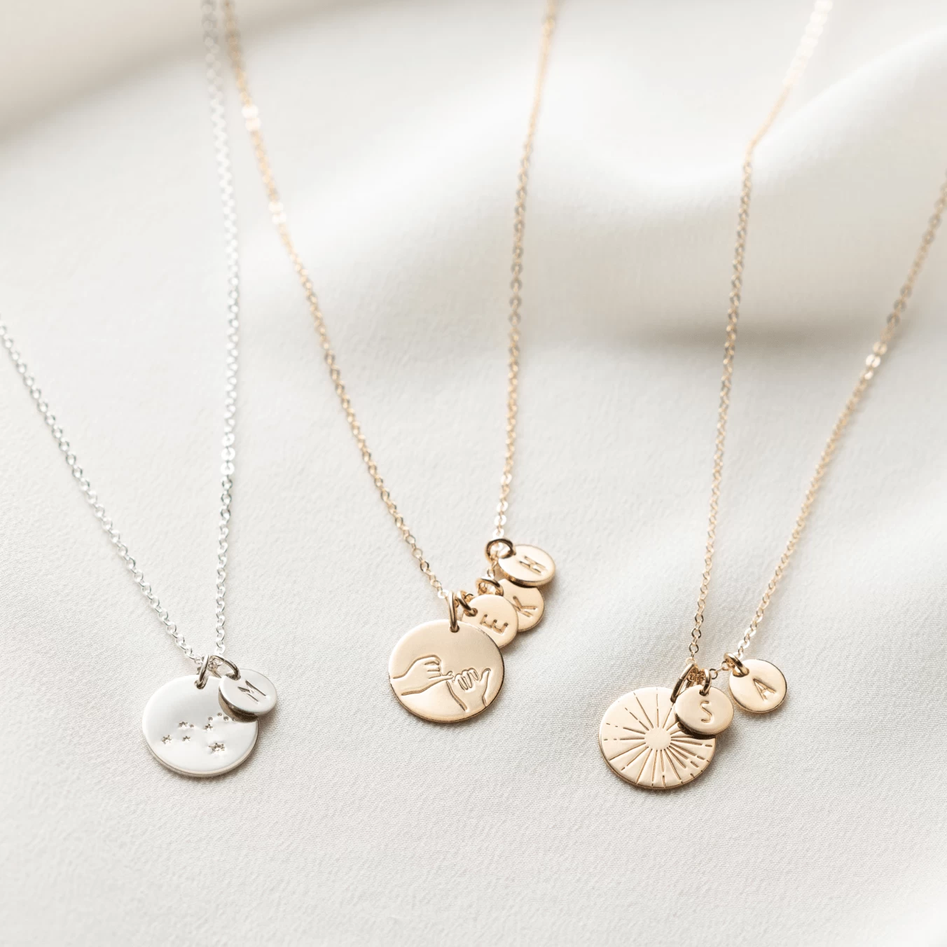 Tell a sparkling story with a symbolic disk paired with (up to five!) tiny initial tags — one for all your loves.
