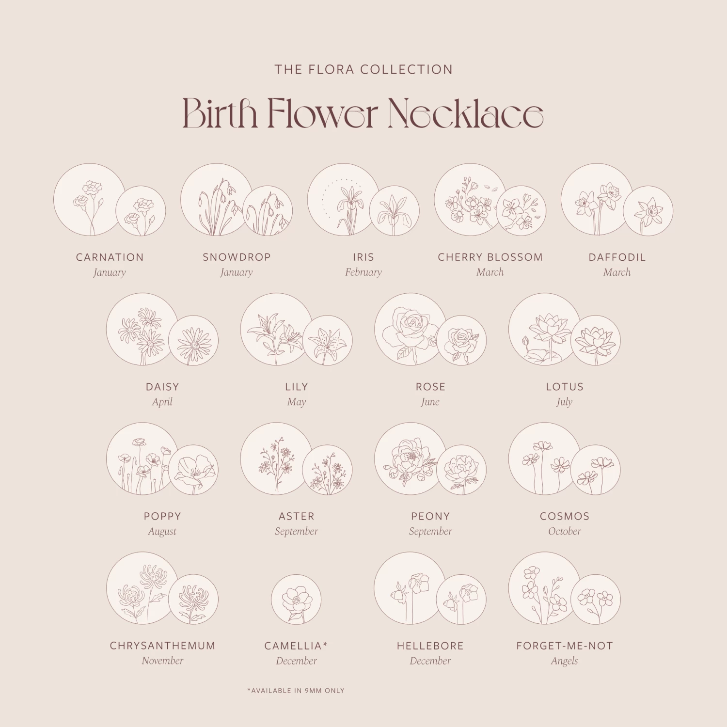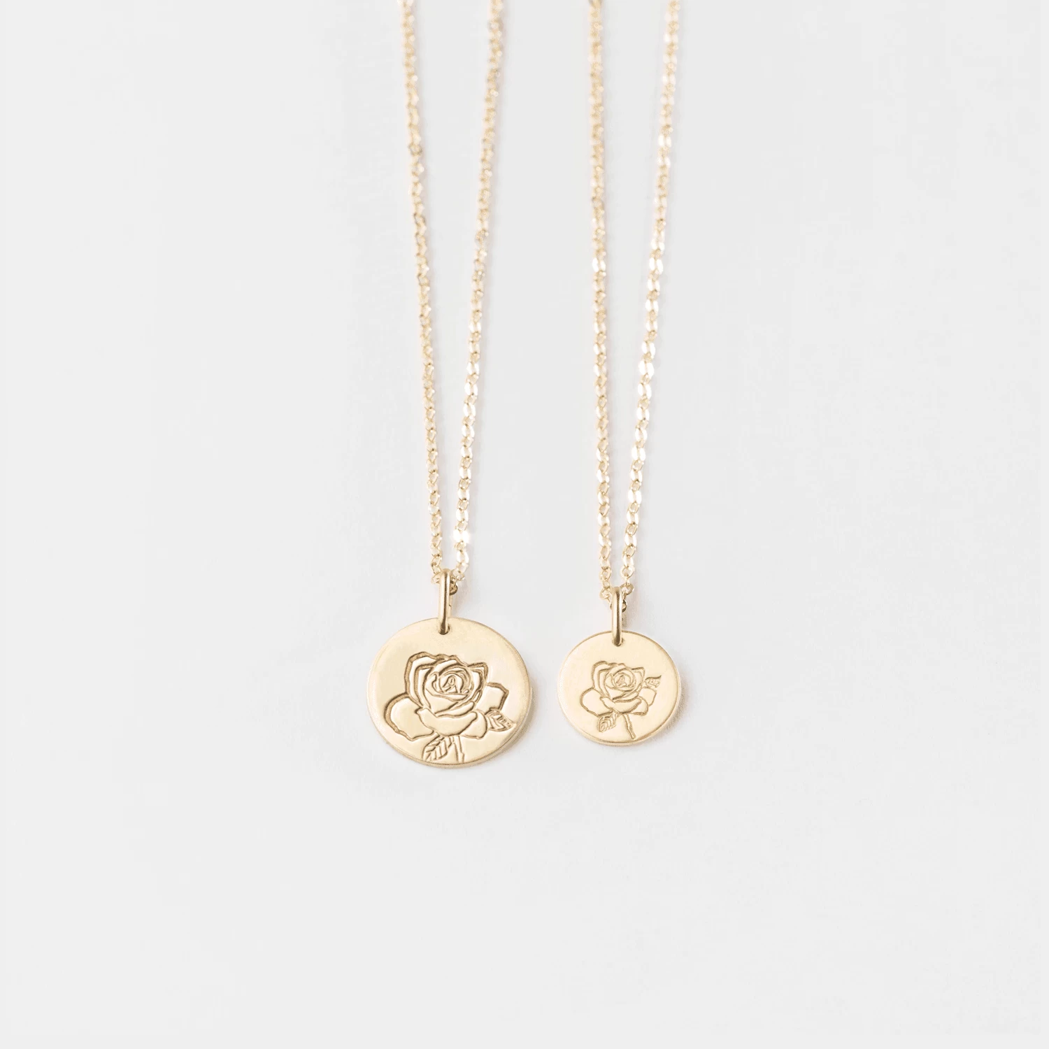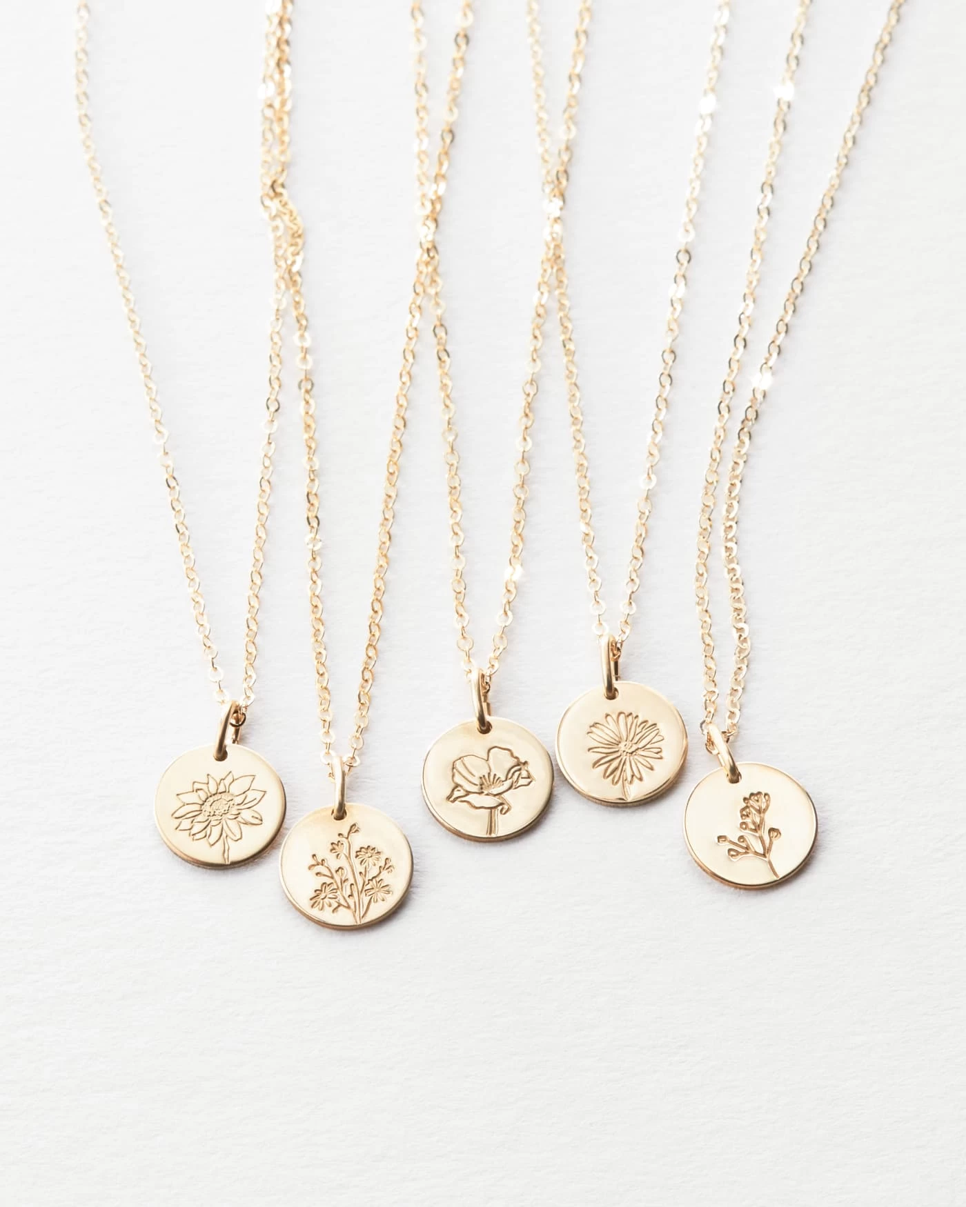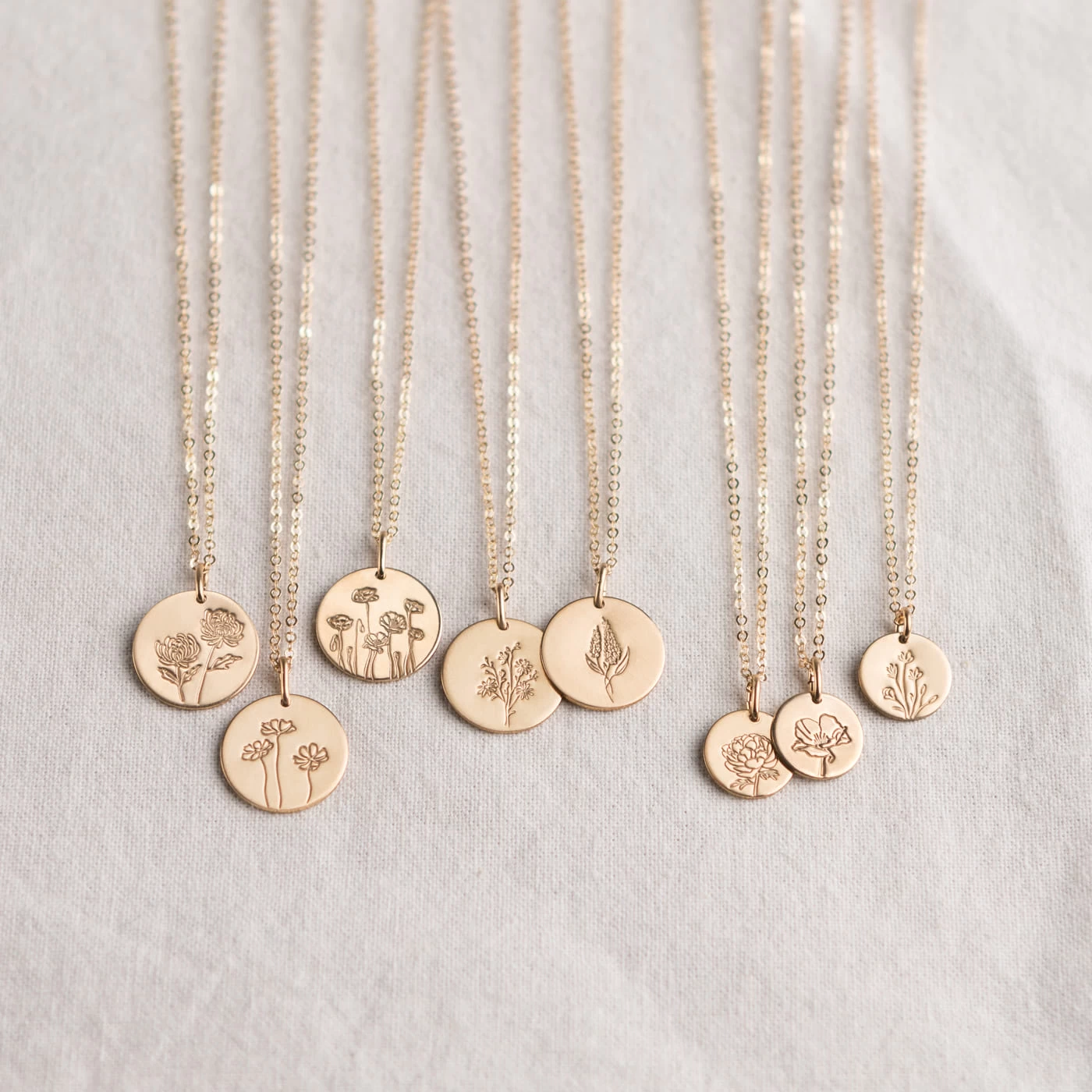 Each birth flower necklace is elegantly illustrated and hand-personalized in our studio using traditional metal punches, strung on our ever-sparkling dainty chain and available in top-quality 14k gold fill, sterling silver and 14k solid gold.