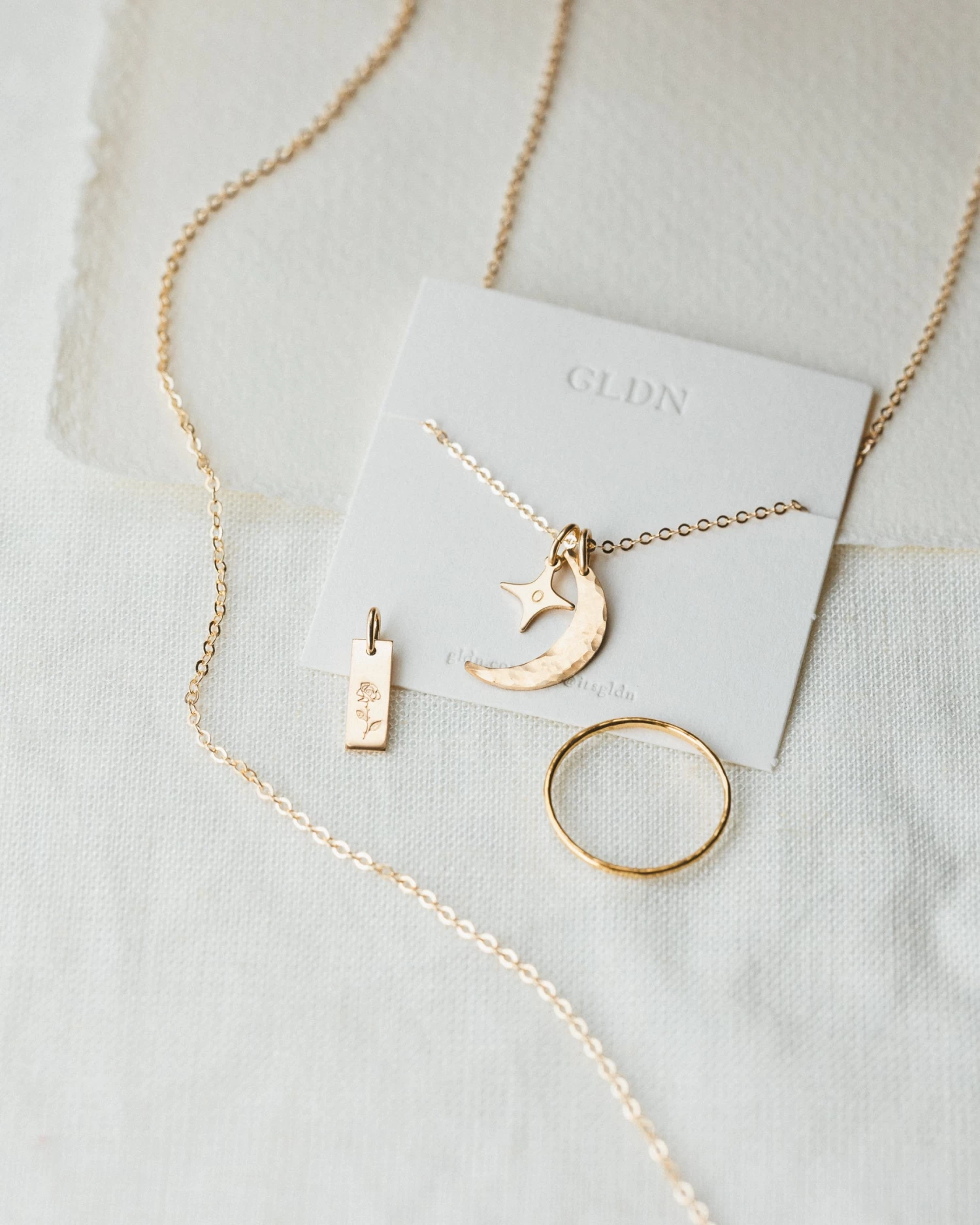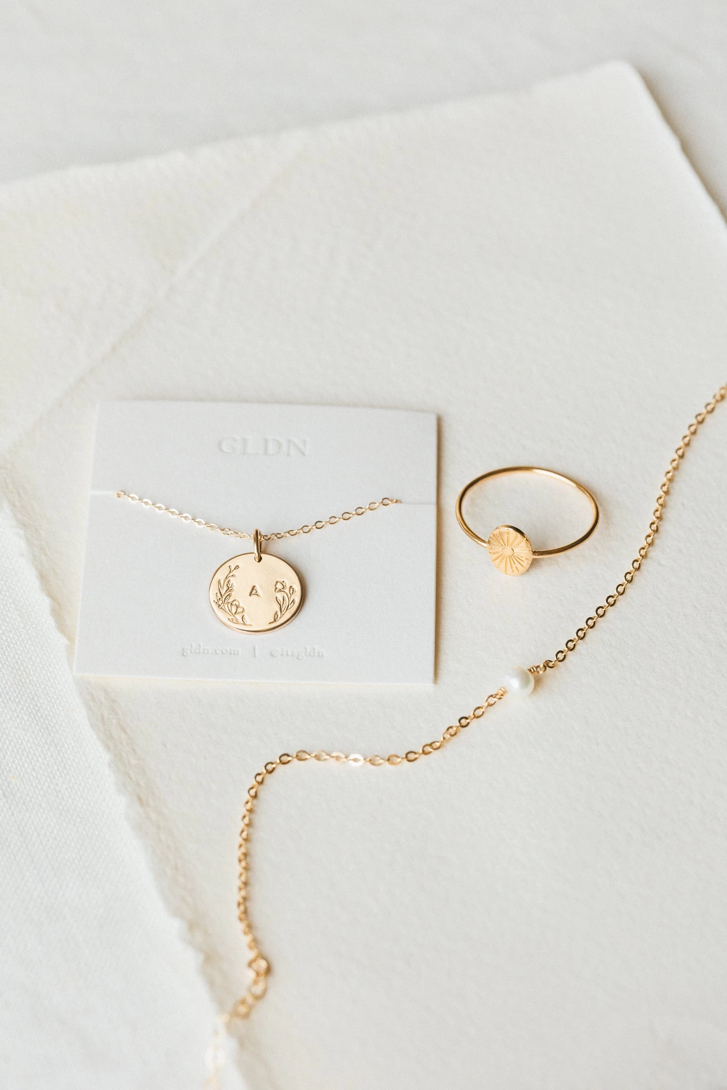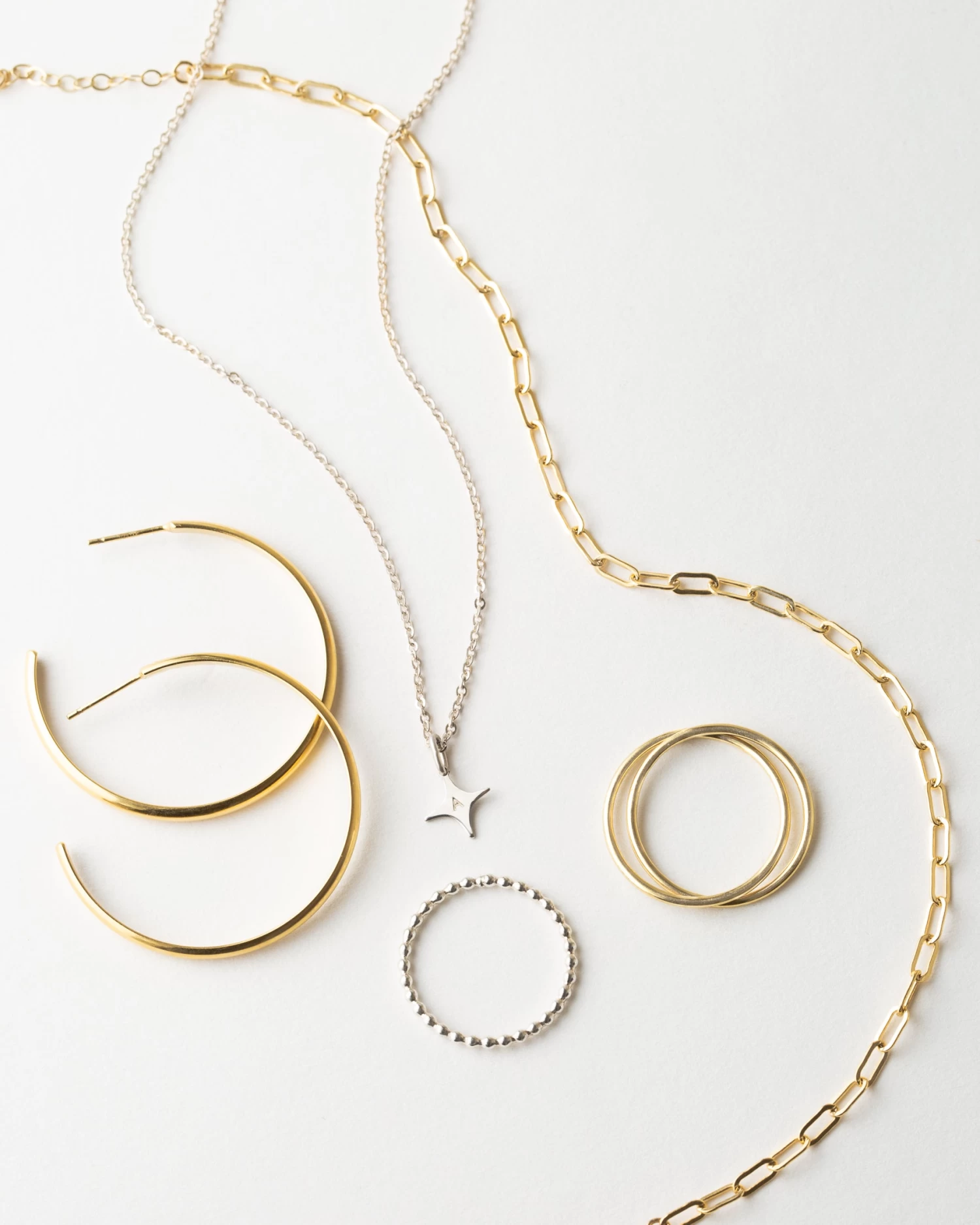 To order, choose your preferred metal(s) and general neck and wrist size from the drop-down menus, then add a note including your ring size and any initials you’d be interested in seeing on a piece.