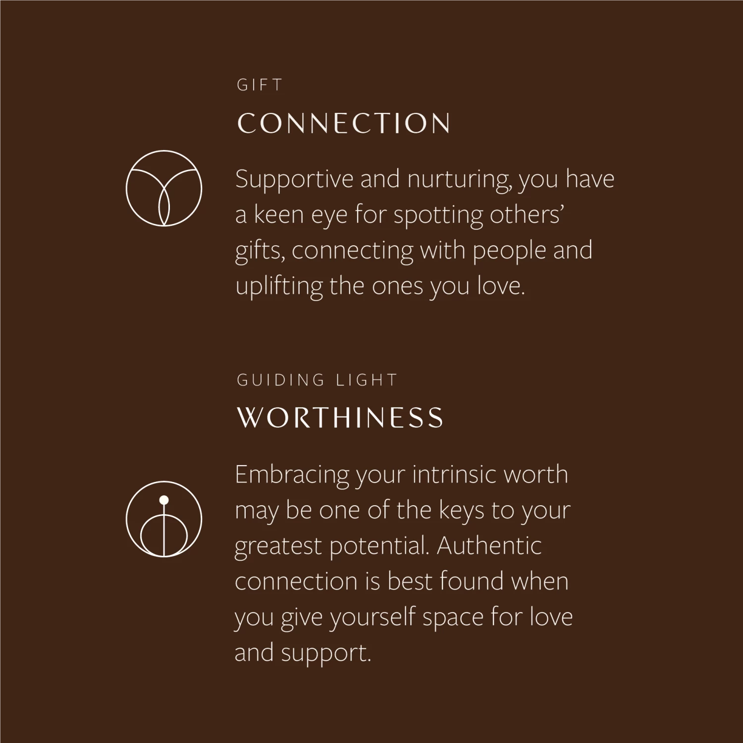 Supportive and nurturing, you have a keen eye for spotting others’ gifts and uplifting the ones you love. Connecting to people with a sense of patience, warmth and generosity is a key strength of yours—and what a strength it is!