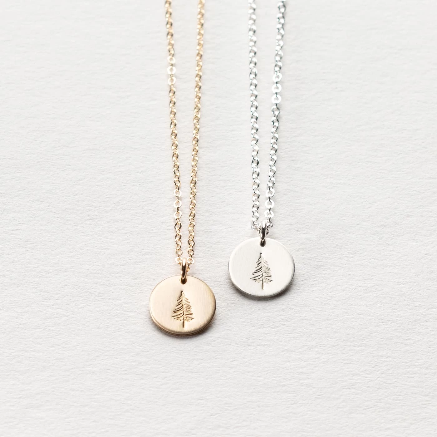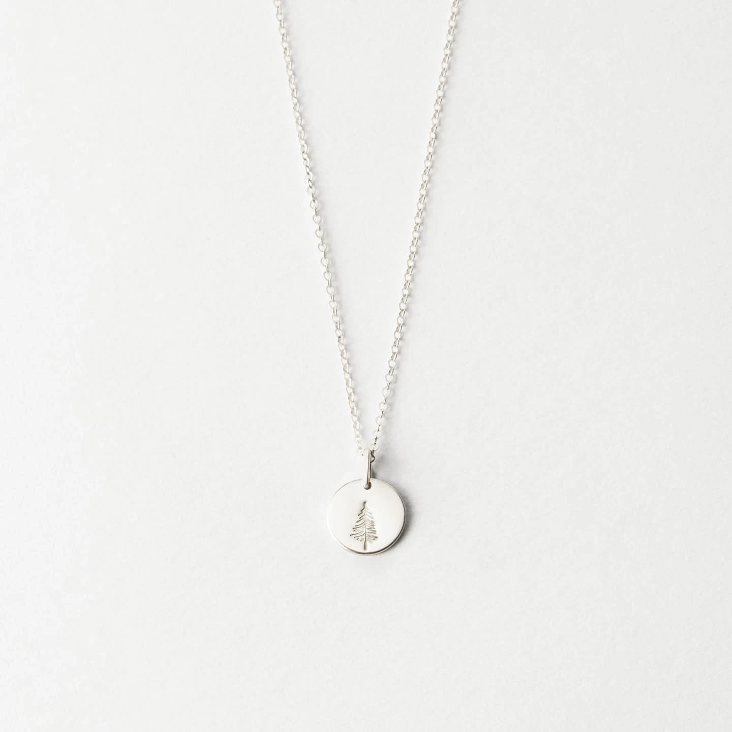 An illustrated evergreen tree, hand-stamped onto a small, 9mm disk pendant. Stand tall.