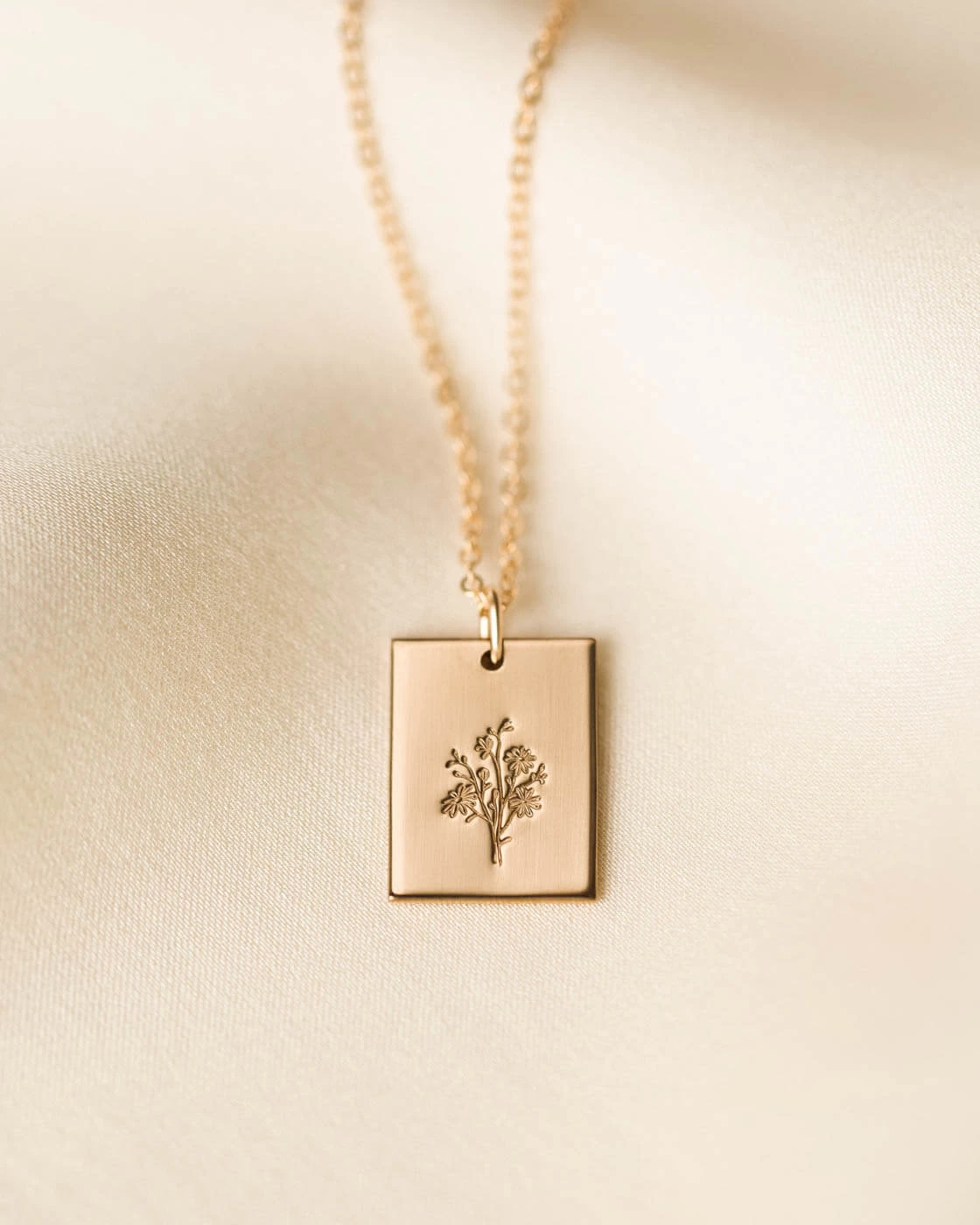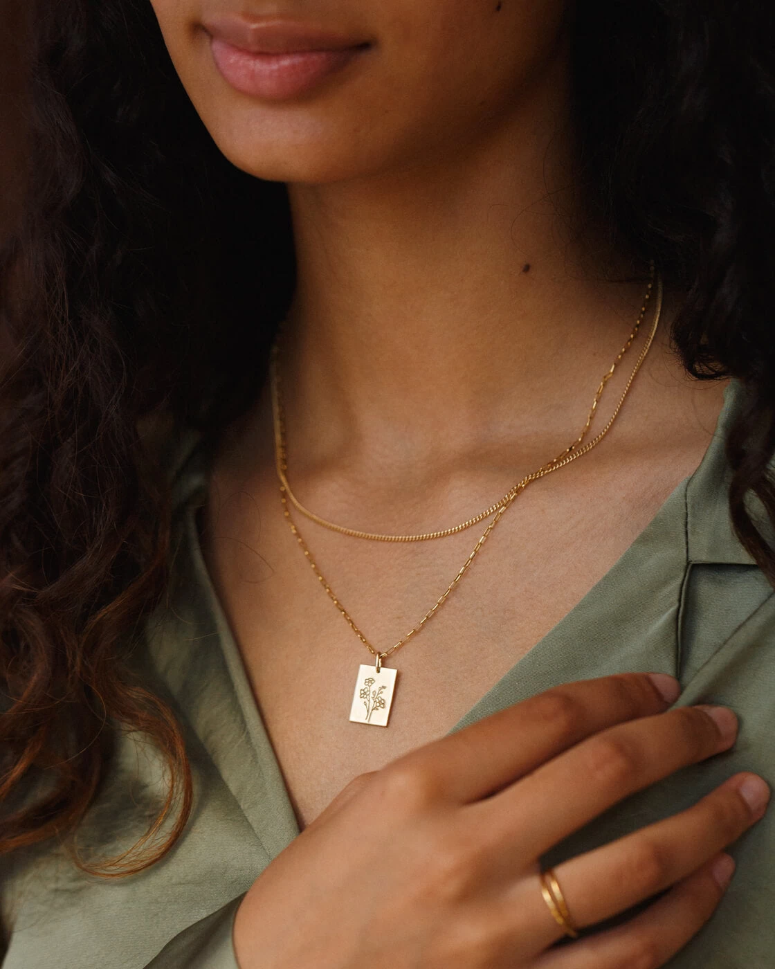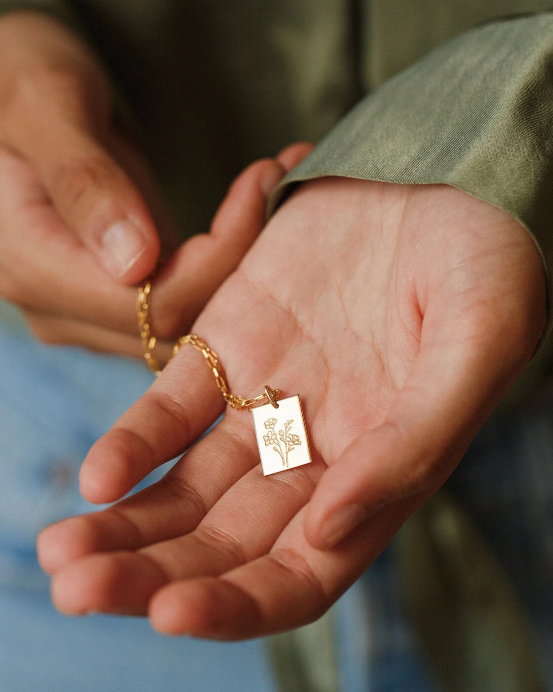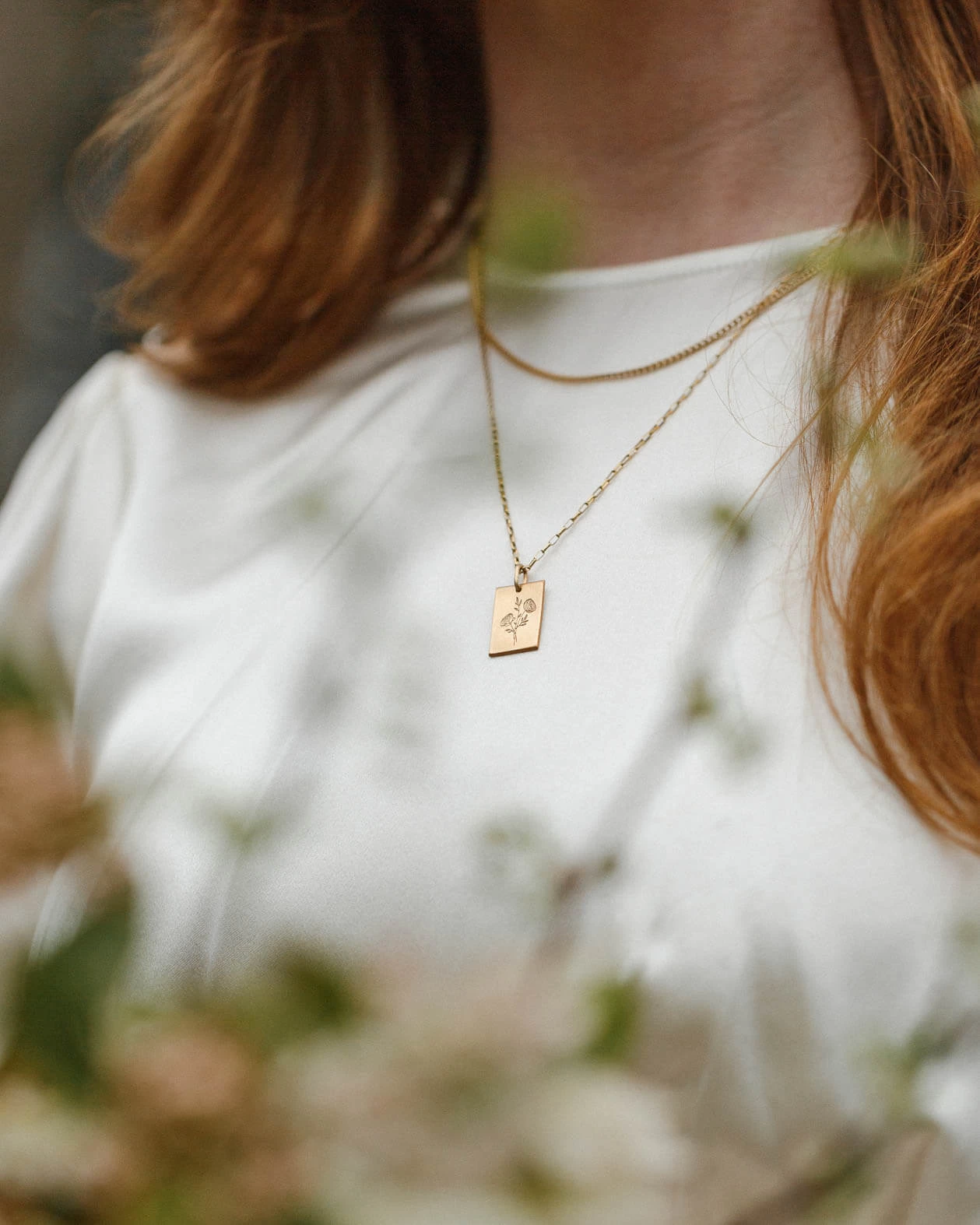 Romantic florals. Angular silhouette. This boxy pendant necklace is a master class in mixing masculine and feminine energy, because we’re never just one thing. Each flower is elegantly illustrated and stamped by hand in our studio.