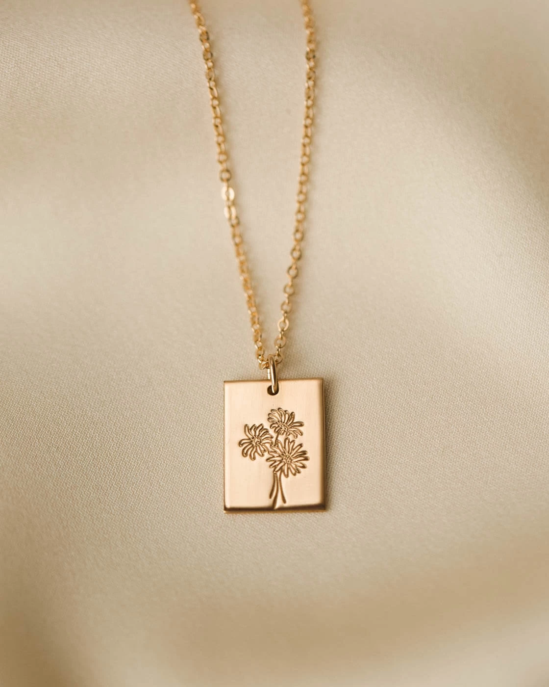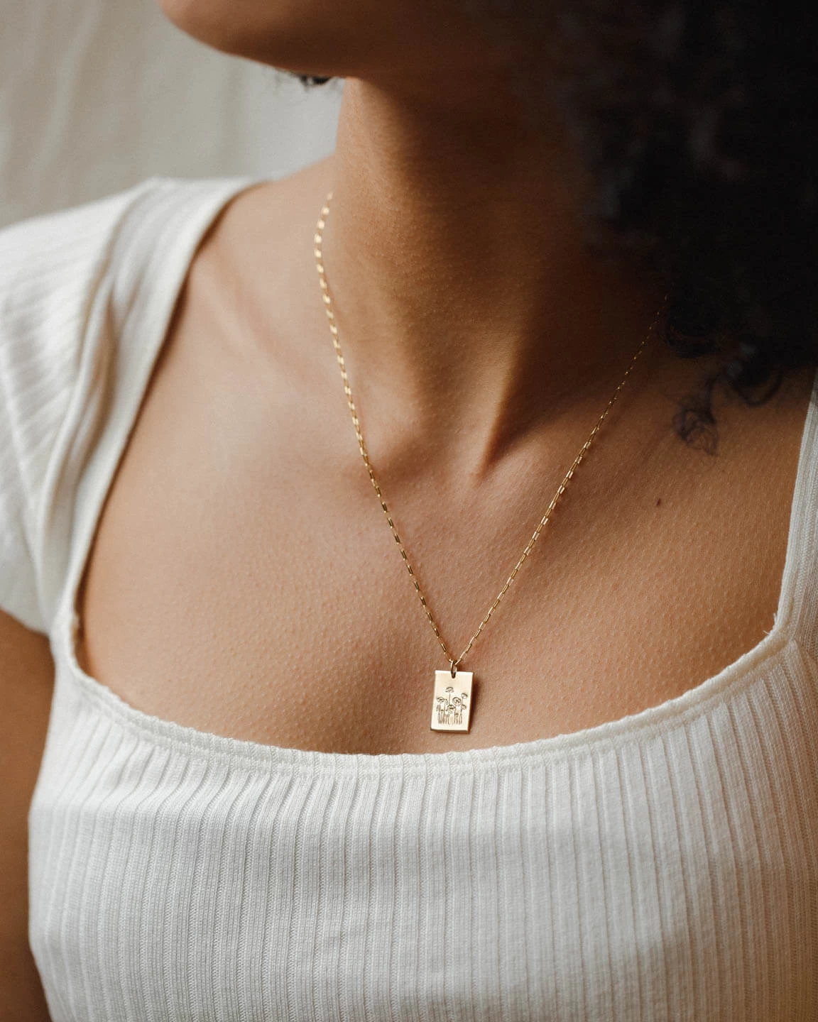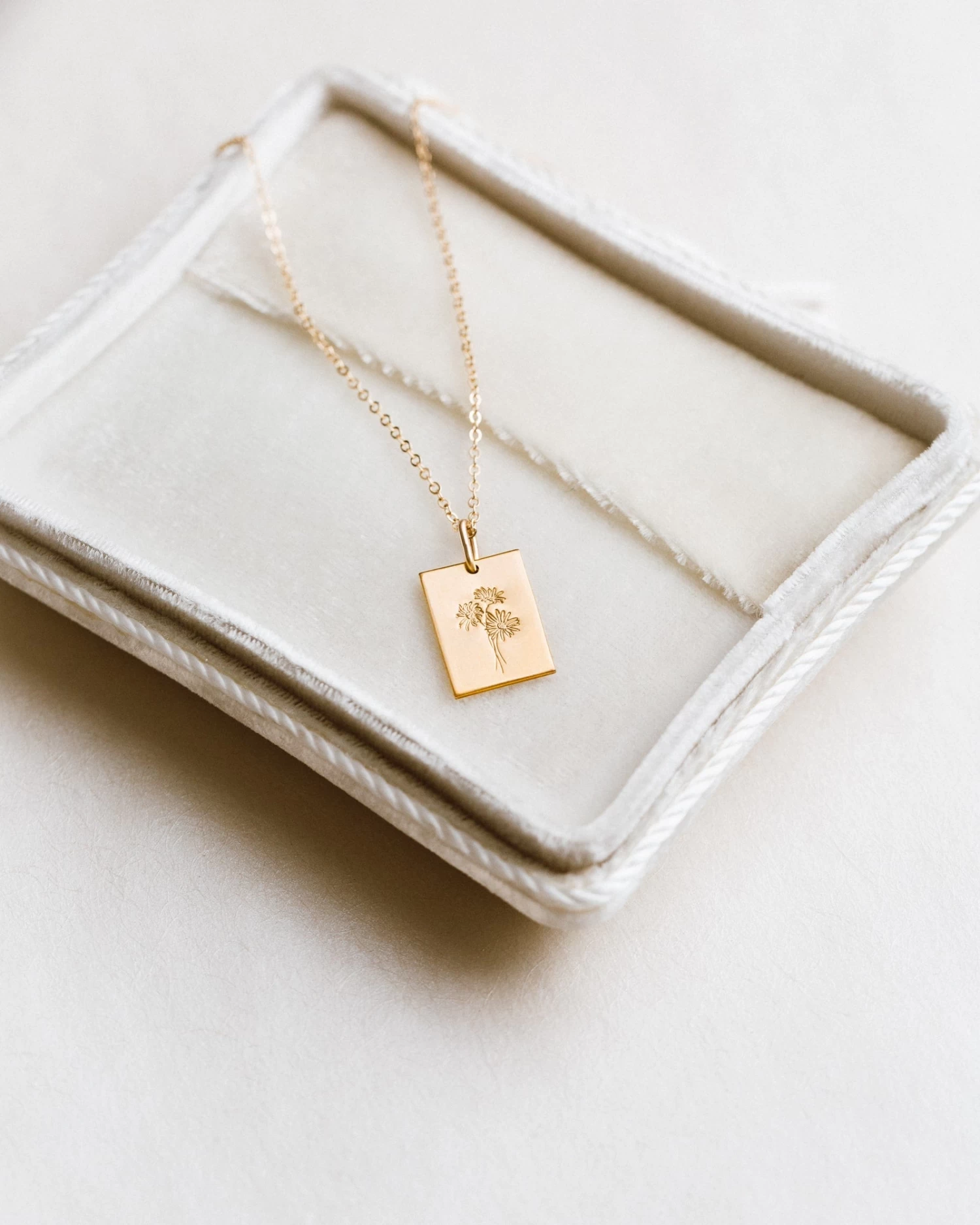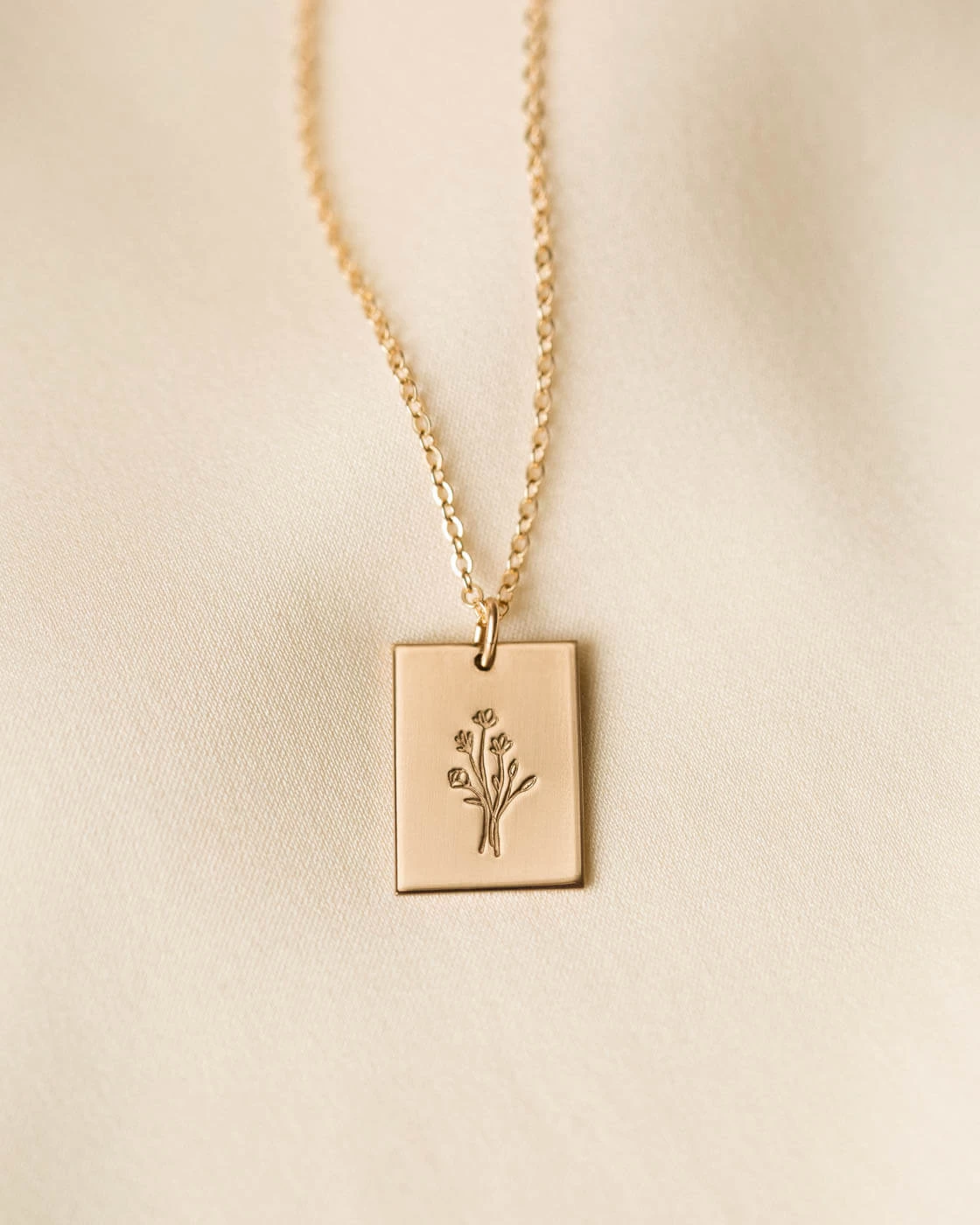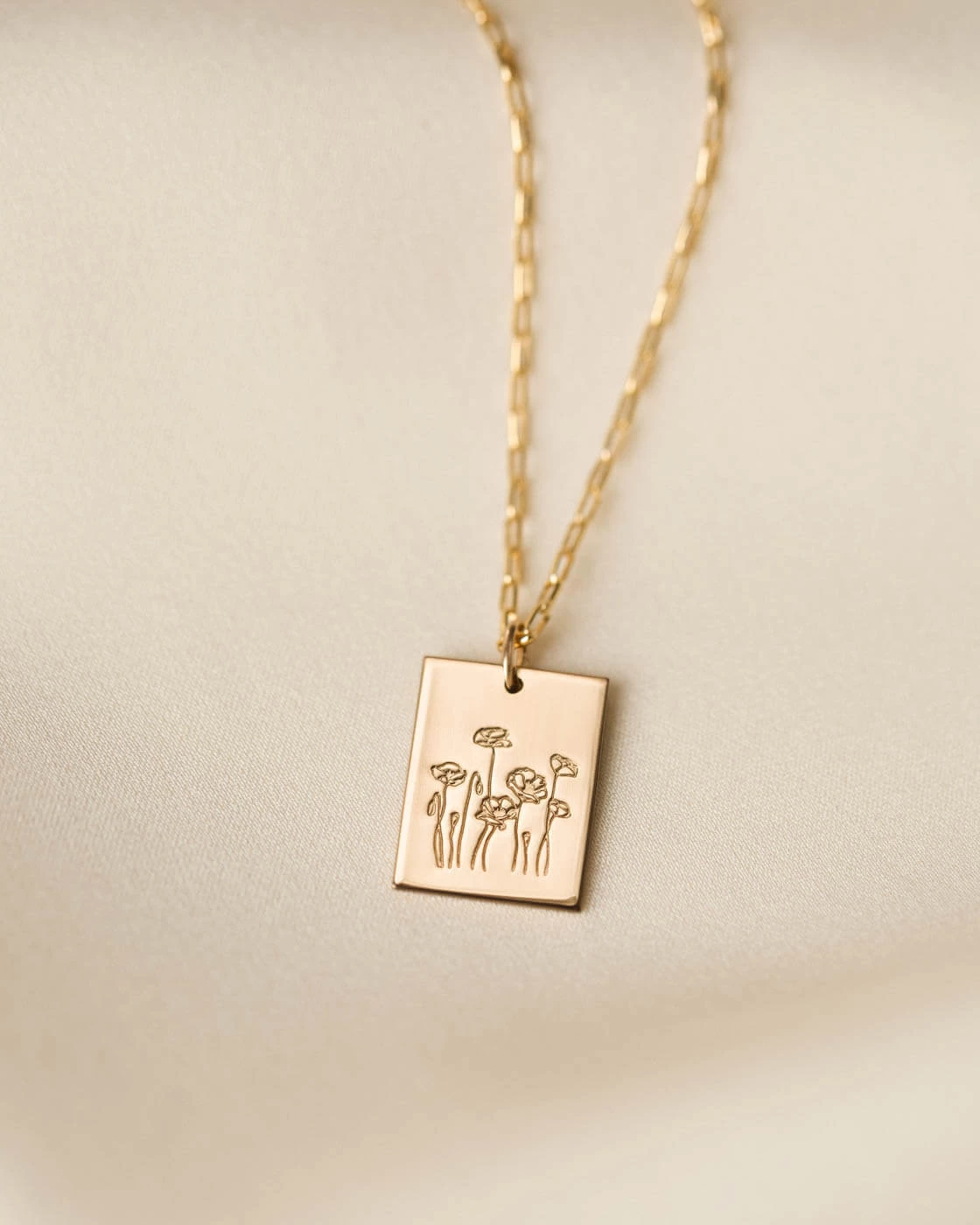 Romantic florals. Angular silhouette. This boxy pendant necklace is a master class in mixing masculine and feminine energy, because we’re never just one thing. Each flower is elegantly illustrated and stamped by hand in our studio.