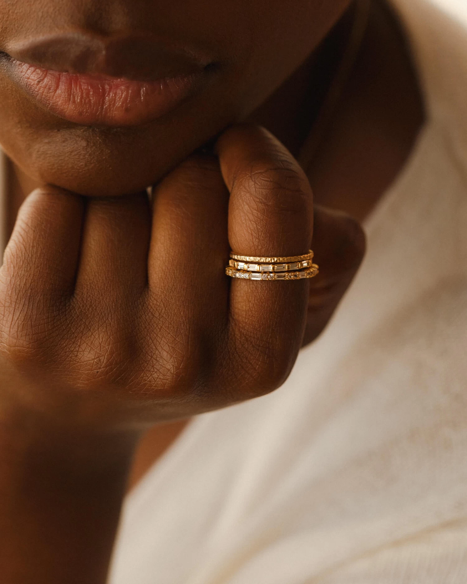 A hint of luxury for everyday delight. Crafted with lab-grown white sapphires for a timeless glow in your ring stack—a best friend to stacking rings, bands and statement rings alike.
