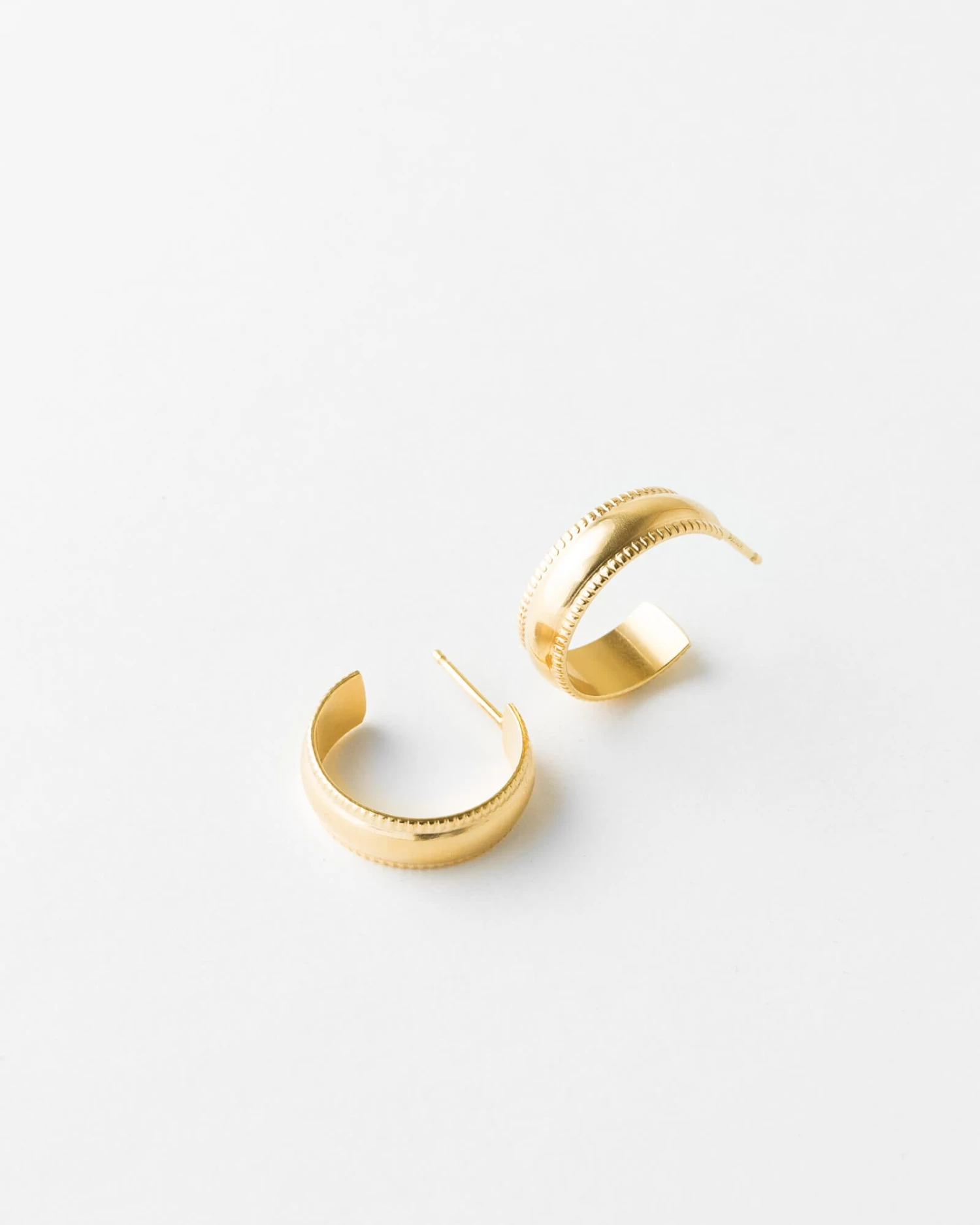 For modern boldness (with a touch of history), try these hoops on for size. Mildred brings alllll of the texture to the party with a thick hoop sure to make a statement. Sold as a pair.