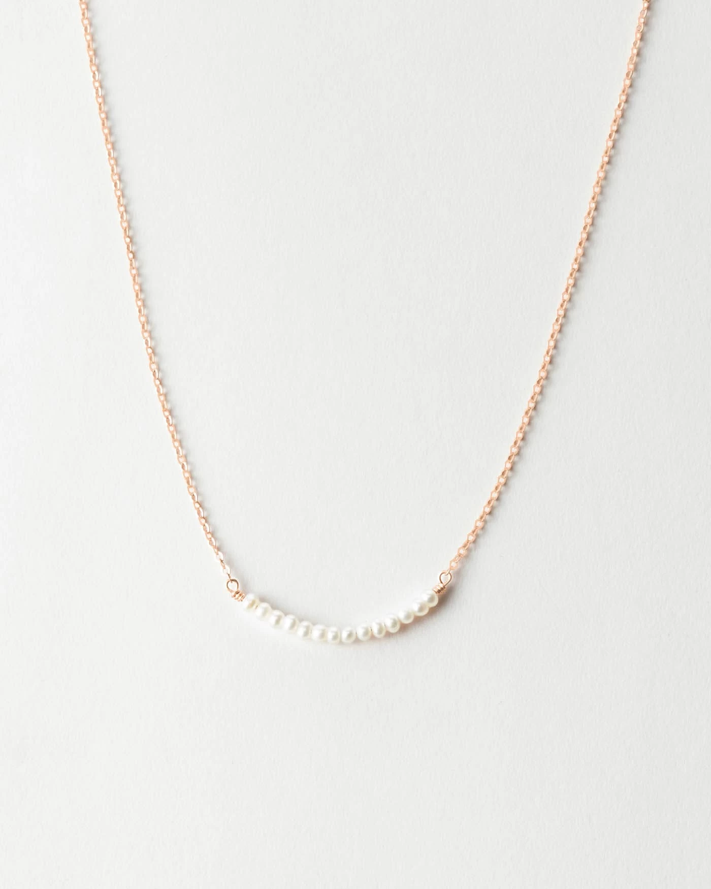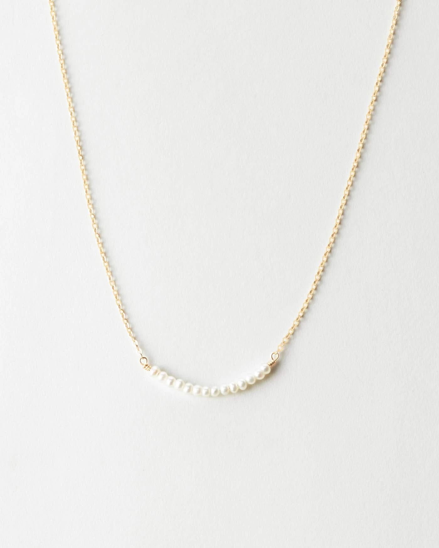 A delicate row of freshwater pearls suspended in chain. Classic, subtle elegance.