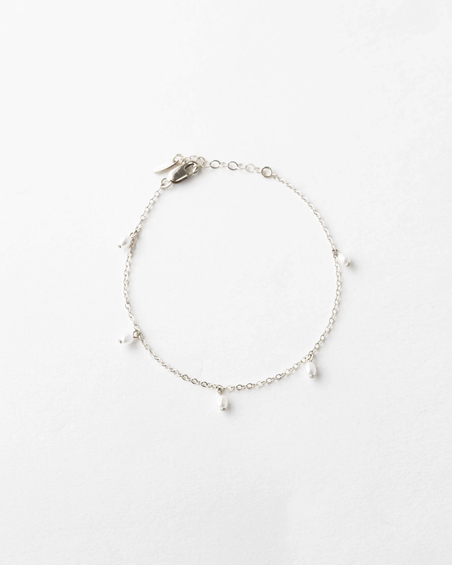 Romance your bracelet stack with tiny freshwater pearls dropped from the daintiest chain—a dance of iridescence for your wedding day, every day or a pearls’ night out.