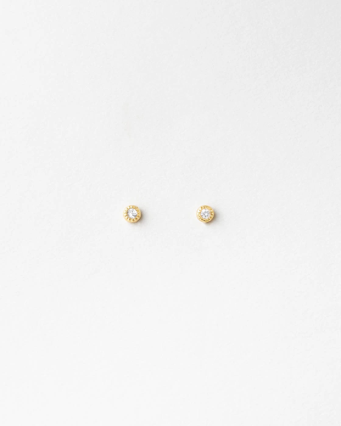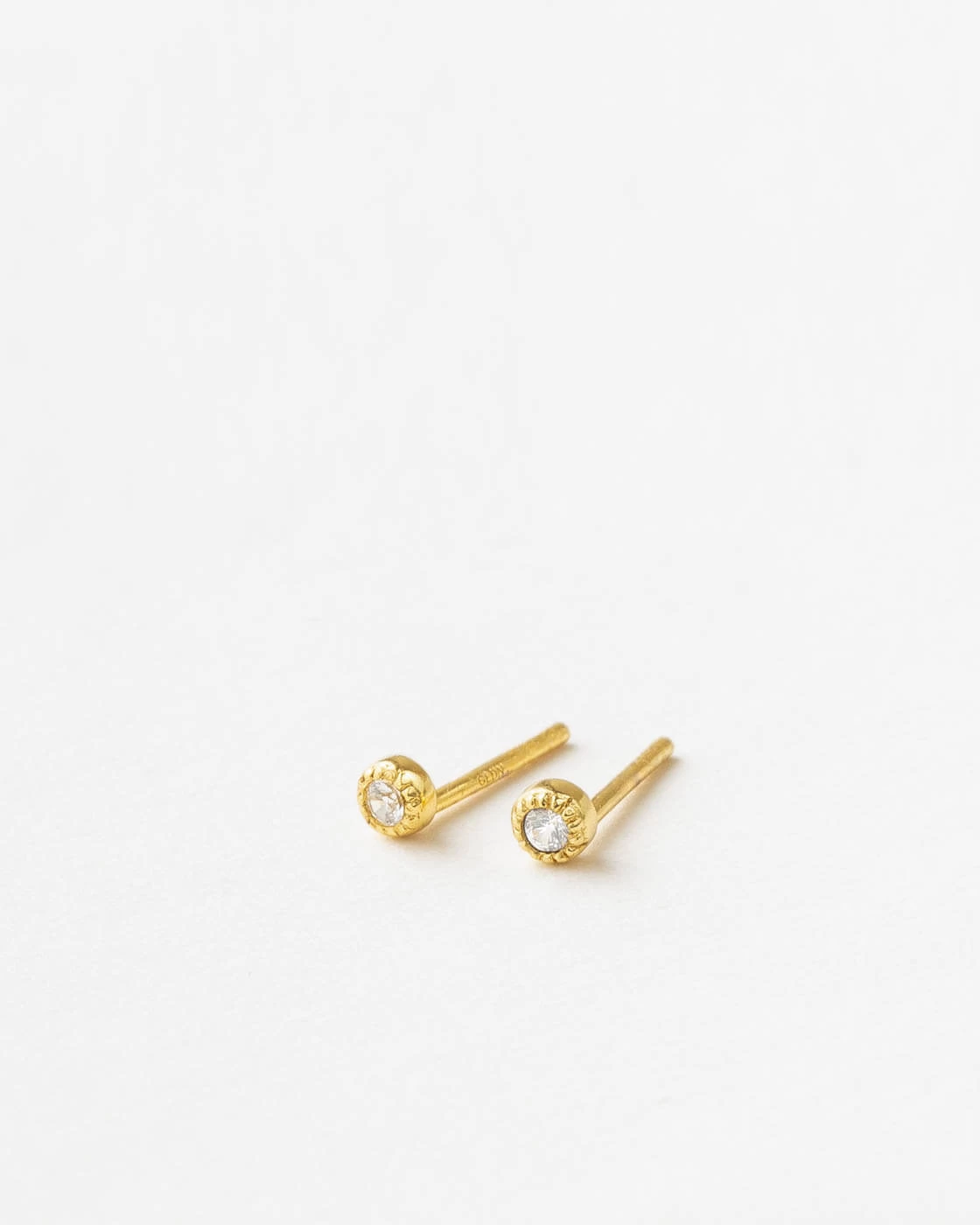 A dotted stud set with a shimmering white sapphire. If your stack needs some sparkle, glitz the one for you. Sold as a pair.