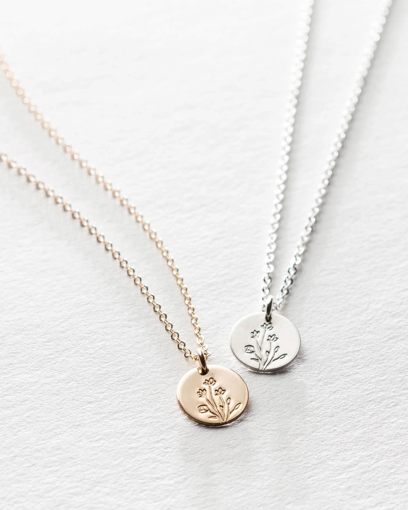 Each wildflower pendant is hand-stamped in our studio to grow with you for a lifetime, available in your choice of 14k gold fill or sterling silver.